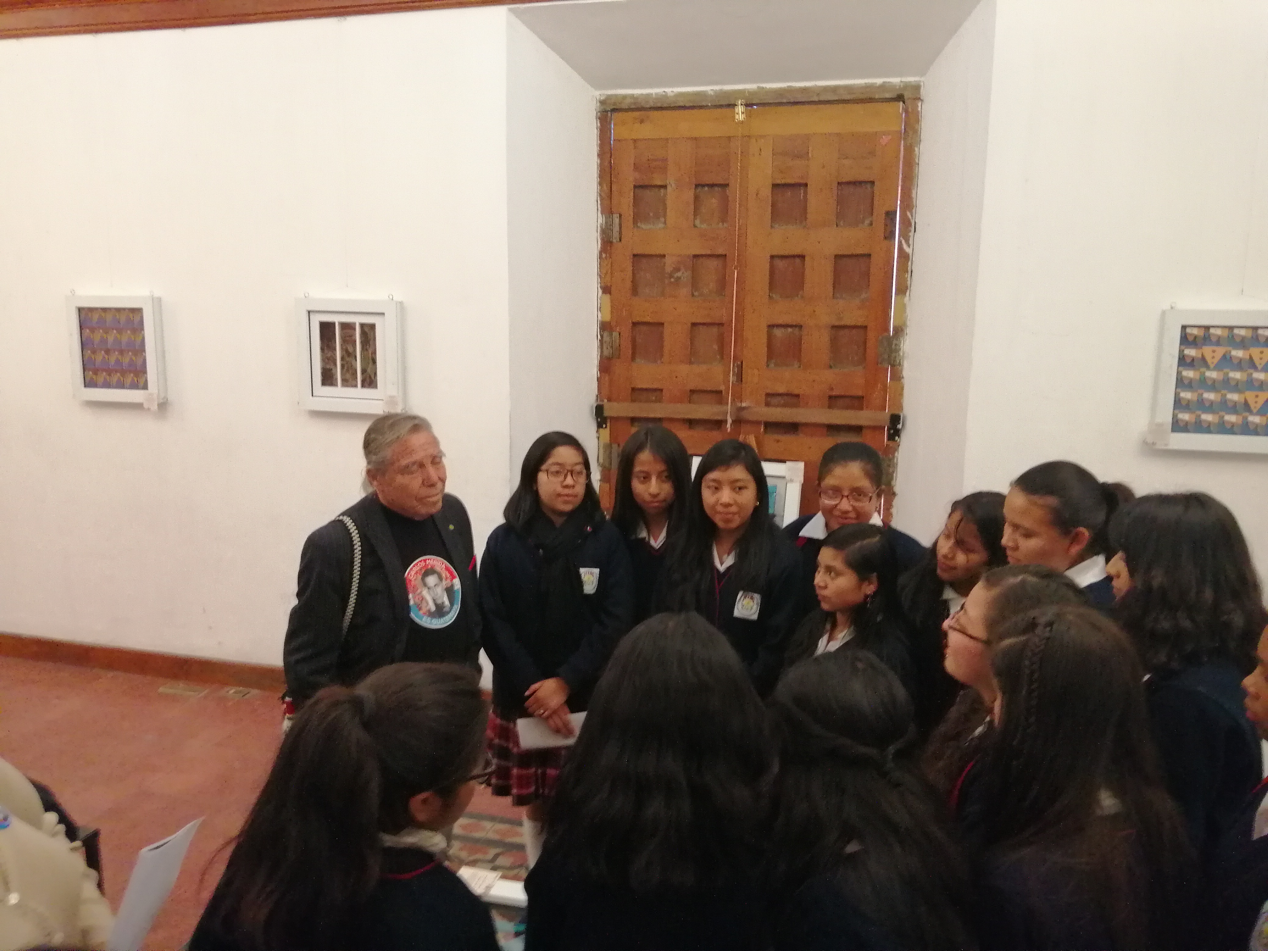 El docente de la carrera de arquitectura, Julio Cesar del Valle comparte con estudiantes que visitan la exposición dedicada a Carlos Mérida.
