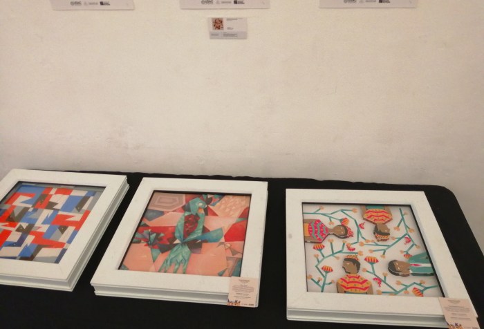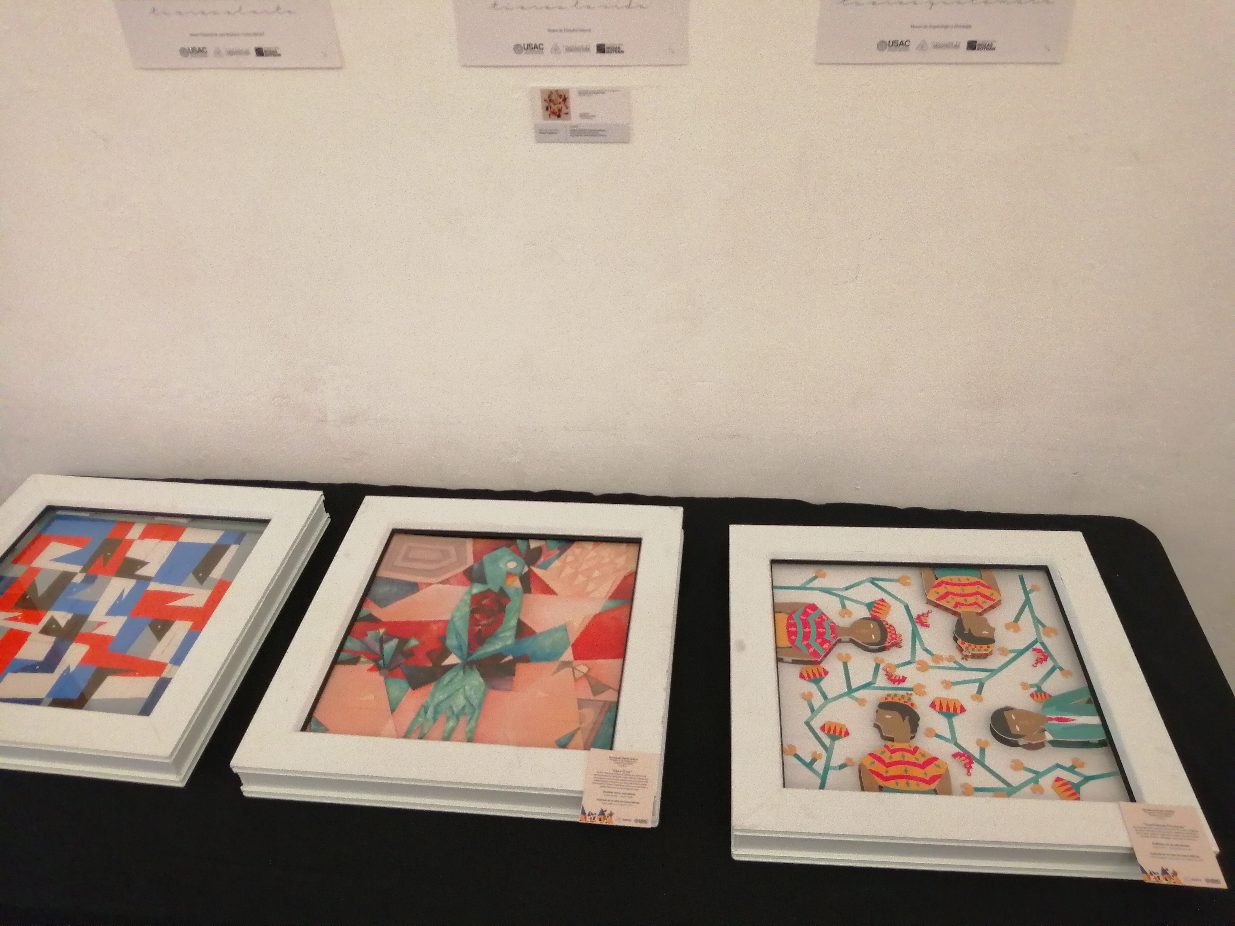 Algunos cuadros en tercera dimensión con el estilo del pintor Carlos Mérida, elaborados por estudiantes de la carrera de arquitectura de la Universidad de San Carlos de Guatemala, que se exhiben en Casa Noj.