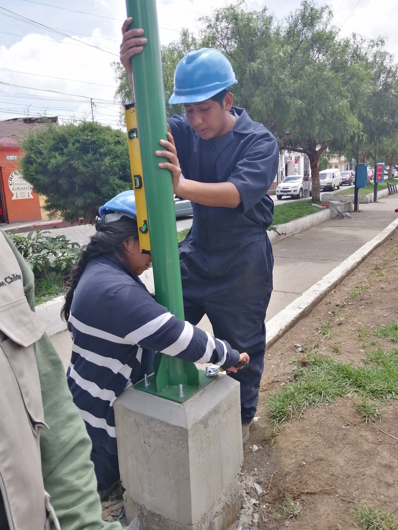 Foto: El Instructor Mario Ixcot del taller de herrería y forja junto a estudiantes de ésta área, instalando lámparas en el parque El Calvario.