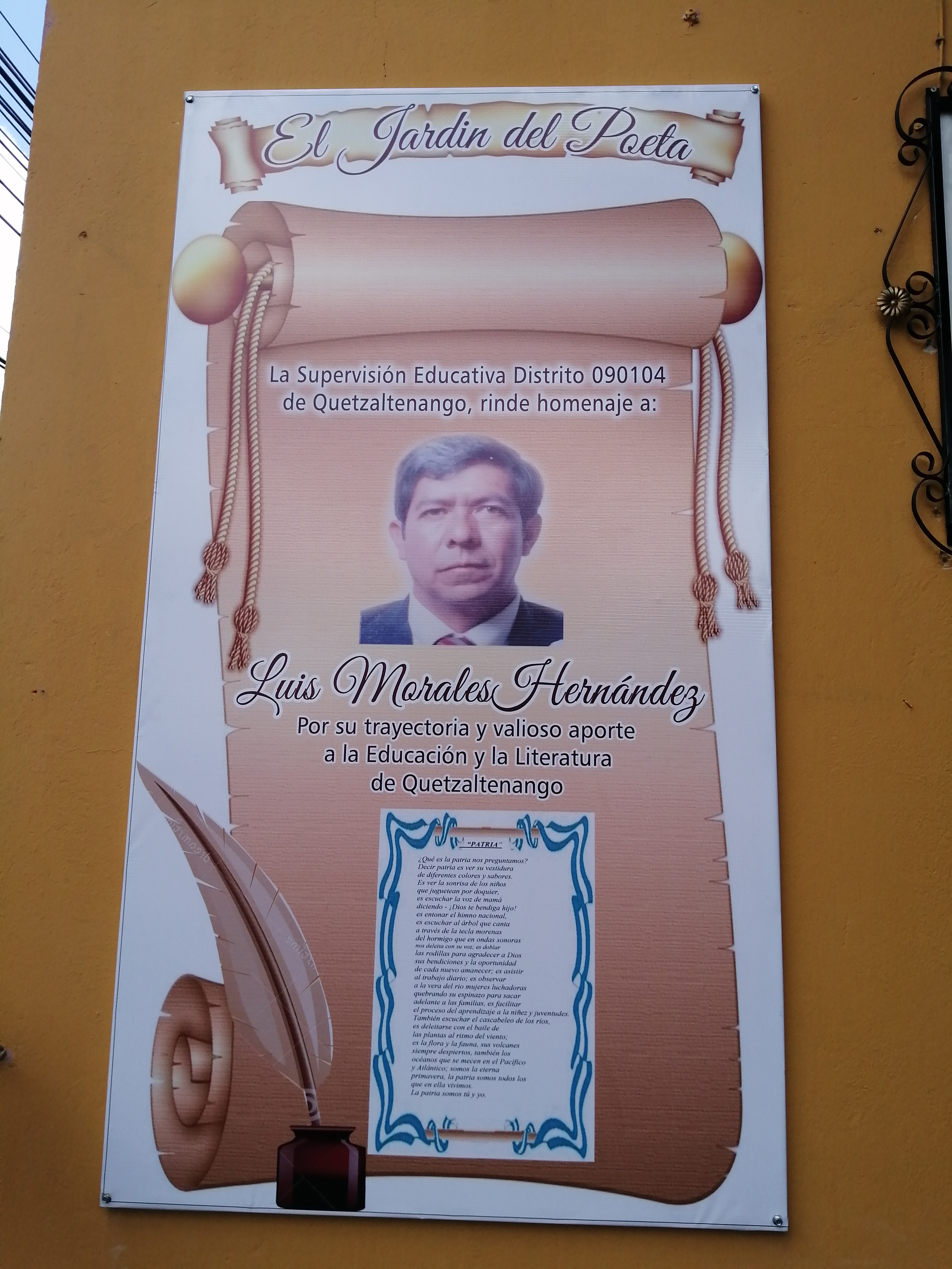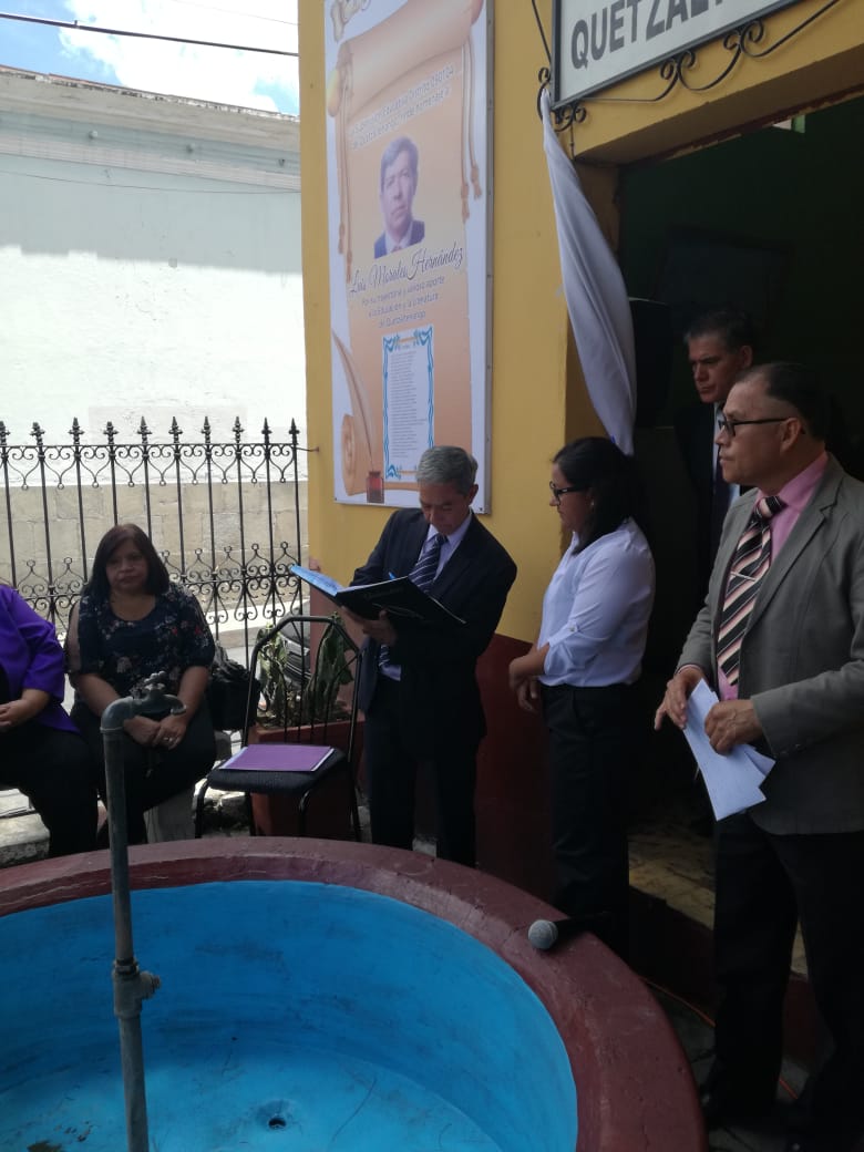 Por. J.C. |Educación |En las instalaciones de la Supervision educativa Distrito 090104 del área urbana y rural de Quetzaltenango, específicamente en el área que a partir de hoy será llamado El Jardín del poeta, se brindó homenaje al profesor y Licenciado, Luis Morales Hernández, por su trayectoria y valioso aporte a la educación y literatura de ésta ciudad.