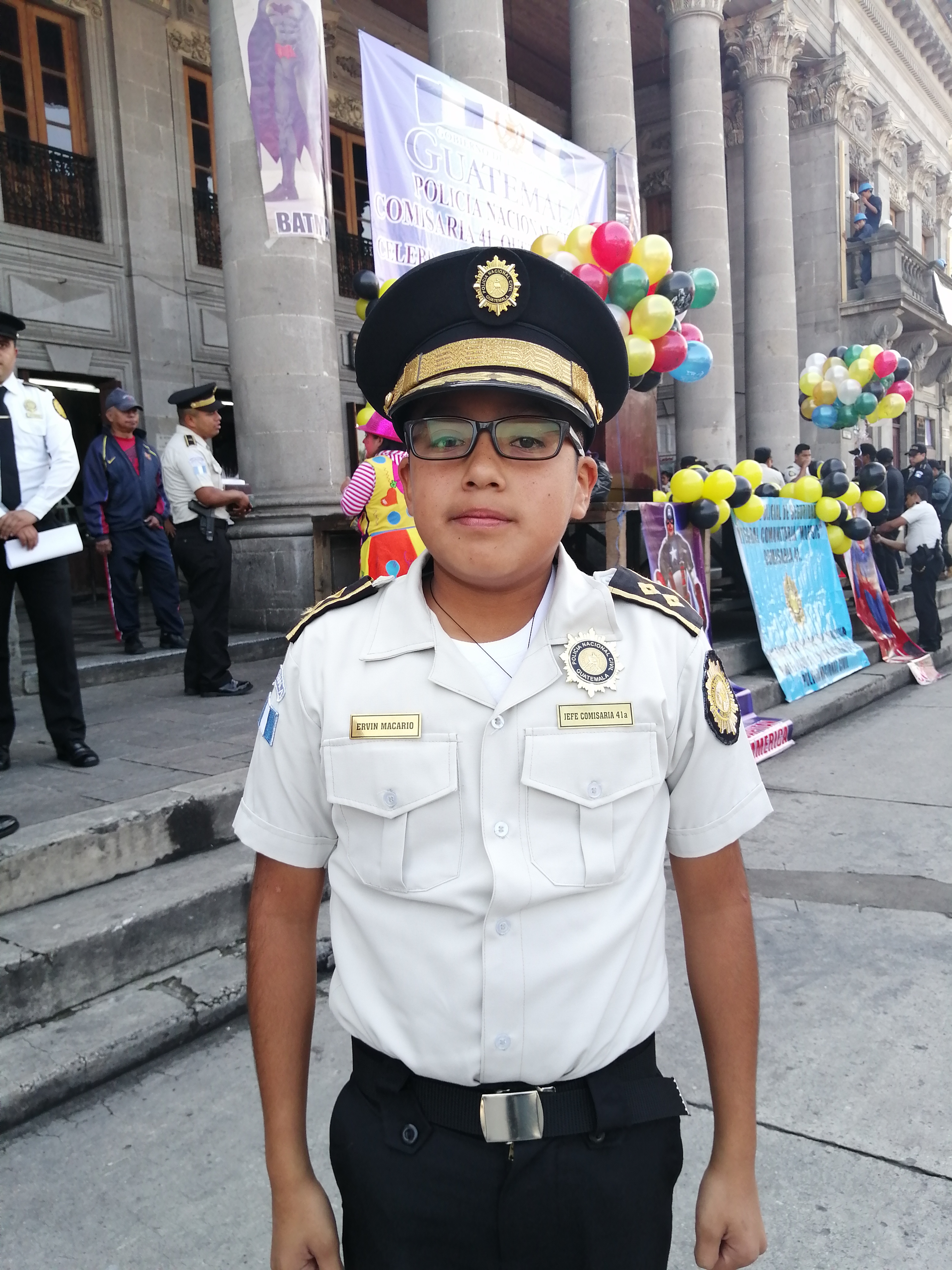 También participó Ervin Macario niño Jefe comisario de la comisaría 41, quien en un momento que le cedieron dentro de los actos, compartió sus palabras invitando a los niños principalmente, a valorar el trabajo de los agentes de la policía, respetar y obedecer a los padres, estudiar, ser honrados y no decir mentiras, hacer deportes y enamorarse de Dios. Brindó además un mensaje a niños con capacidades especiales, motivandoles con su mensaje «Dios da niños especiales a padres especiales» además dio a conocer diferentes experiencias que él ha tenido al ser niño comisario manifestando que dentro de su experiencia vivida es además parte de un grupo de iglesia llamado Apóstolines motivando a los niños a escucharle y seguirle por medio de un programa que realizan cada sábado de 11:00 a 12:00 del medio día, este programa lo realiza juntamente a otros niños en Radio Fraternidad donde manifestó que evangeliza a niños que sintonizan este medio de comunicación.