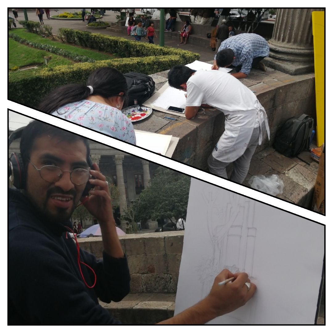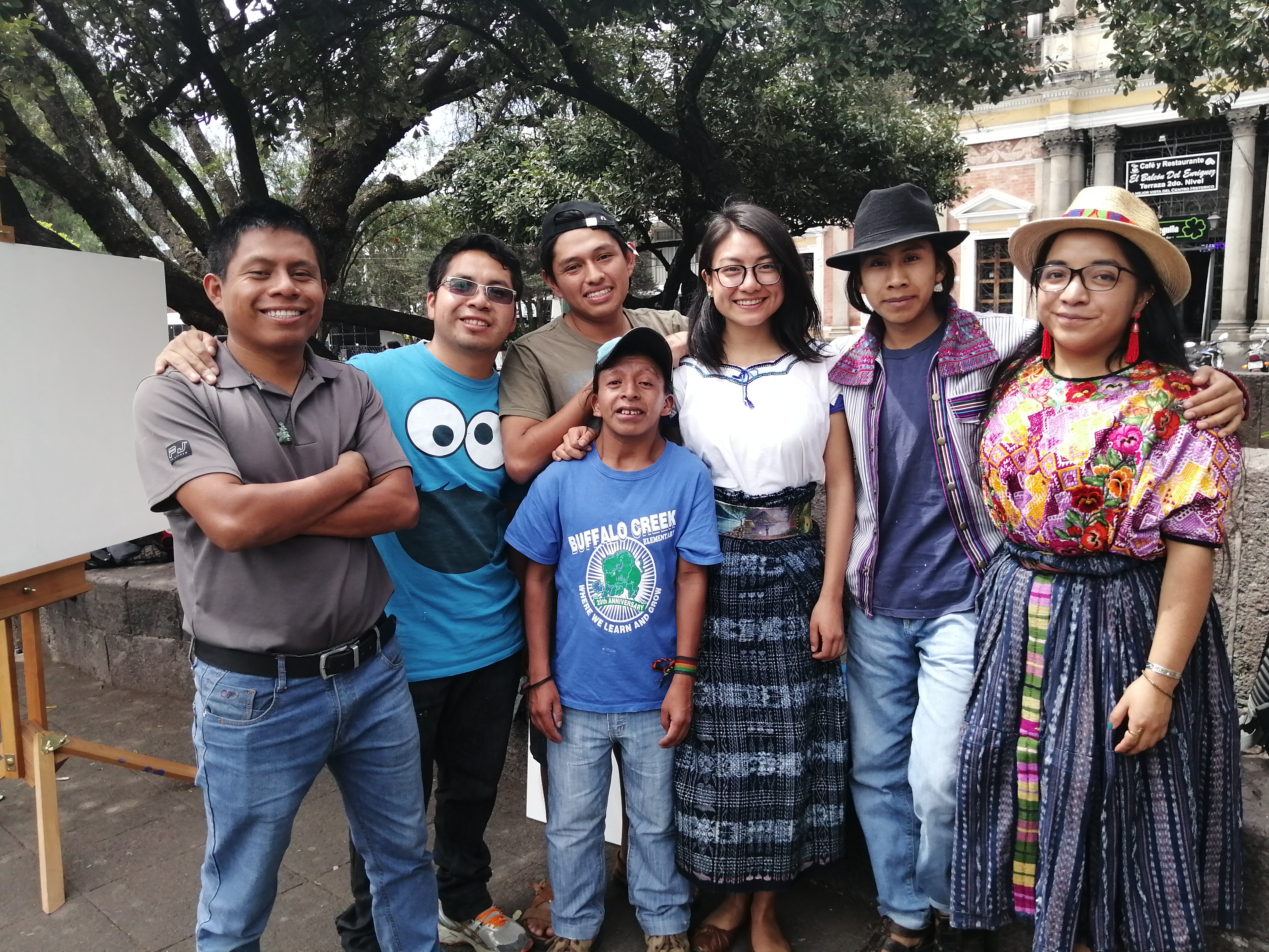 Del municipio de Cantel, Mayali Hernández, Julio Hernández, Angel Hernández, estudiantes del Colegio evangélico Mixto Americano Mark, junto al profesor de arte procedente de Puebla México, Francisco Javier Trejo, trabajan con la técnica acrílico y acuosa respectivamente.