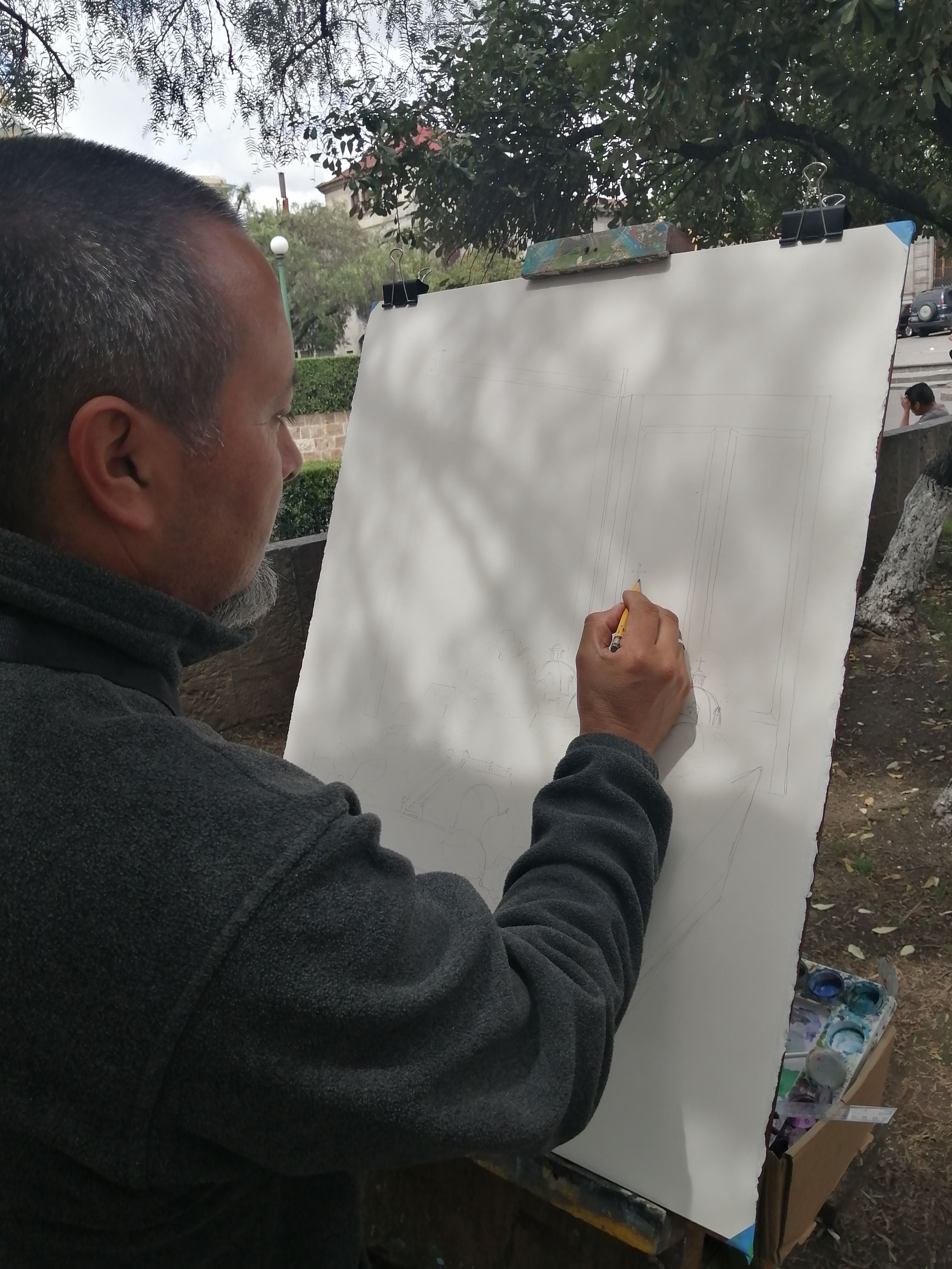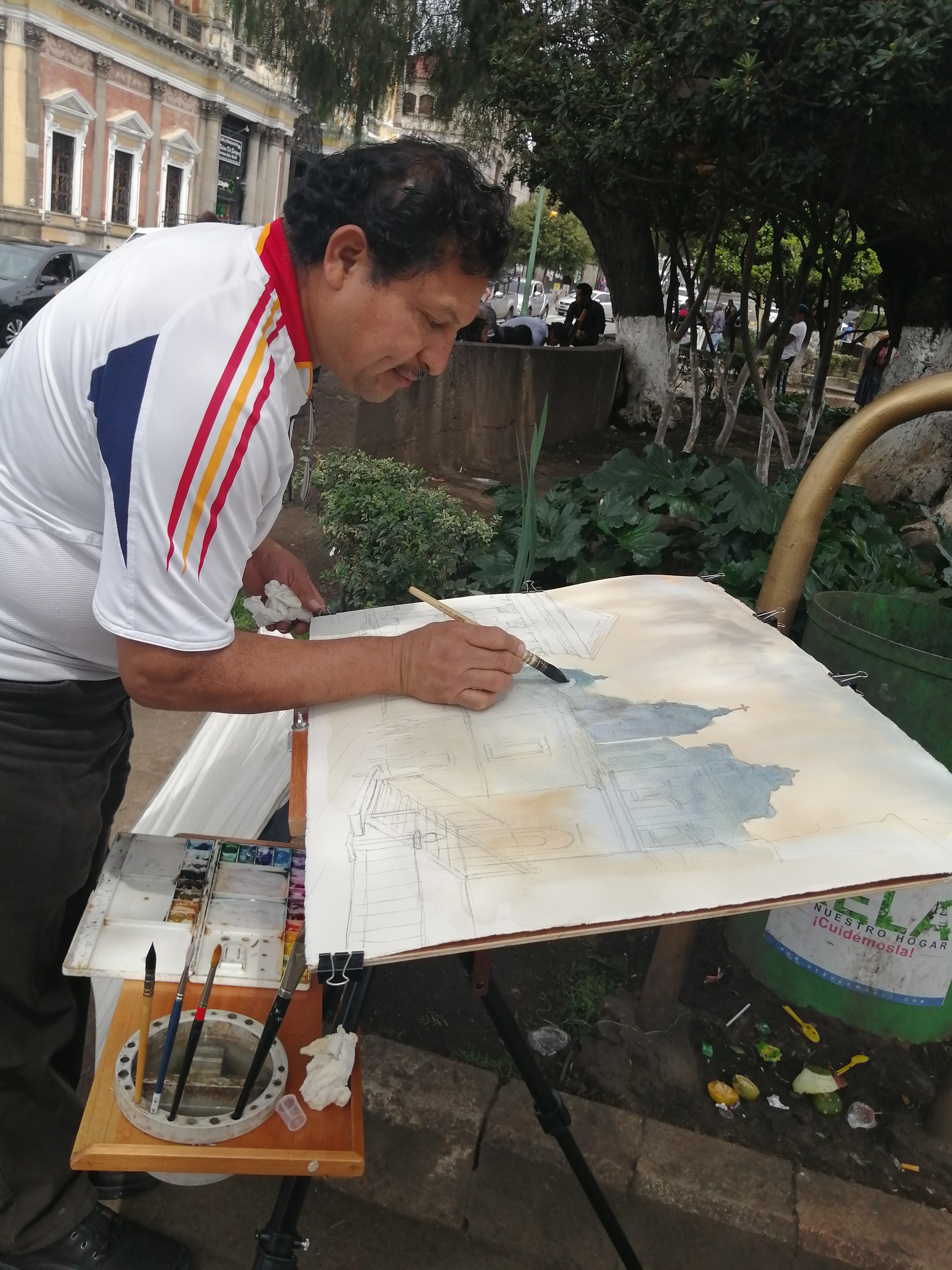 Fabián Hernández con la técnica de acuarela sobre papel, de Antigua Guatemala.