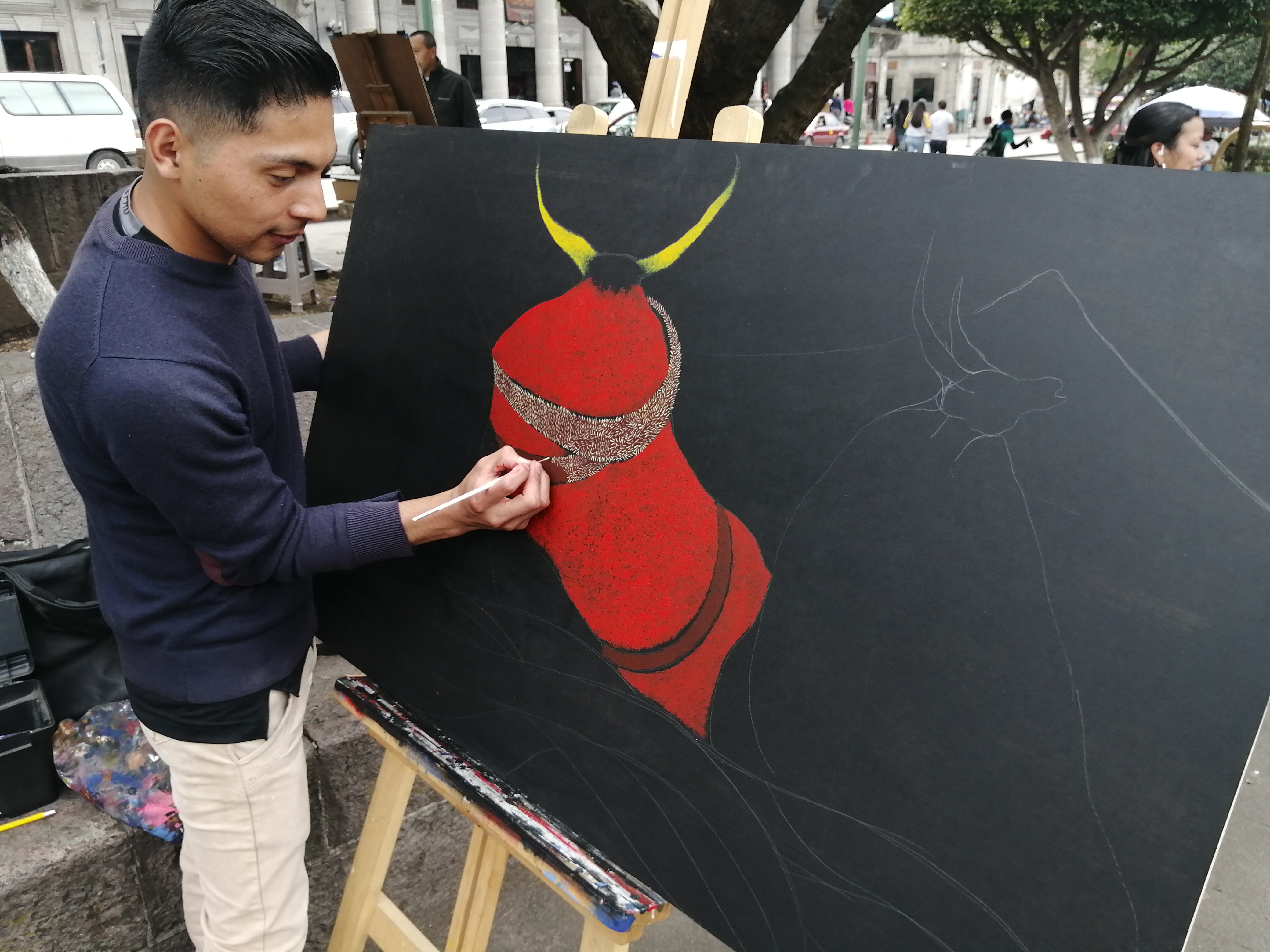 Mario Méndez Estrada, el mayor de los participantes y quién trabaja en acrílico viene de Guatemala, aunque es nacido en Quetzaltenango.